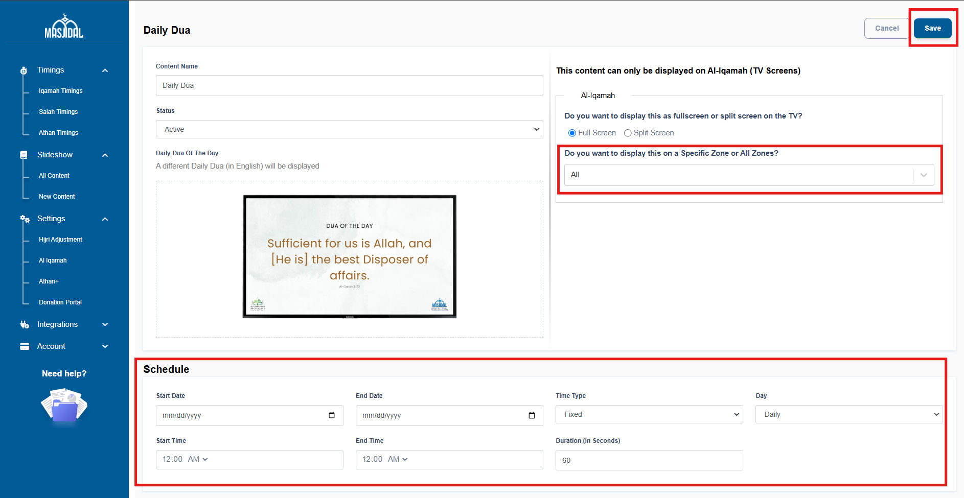 Fill in the fields as needed to schedule it as per your liking. Select the zone dropdown to display on specific screens only. Click save. That’s it, a new dua will be displayed daily based on these settings.
